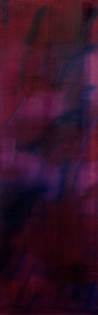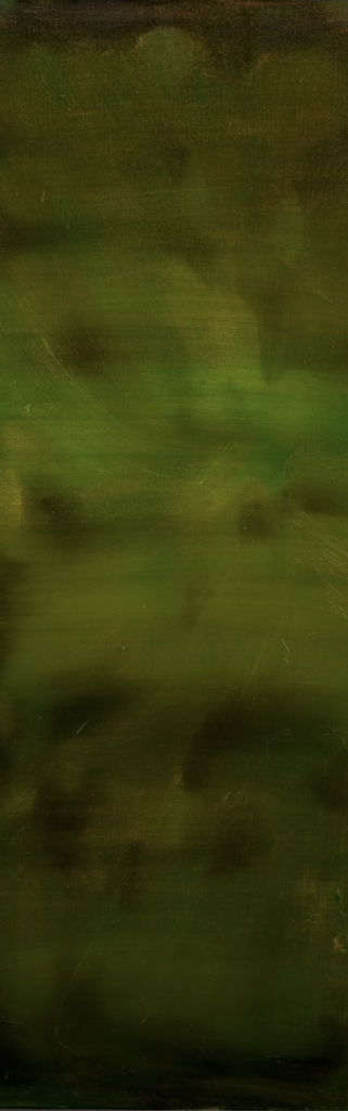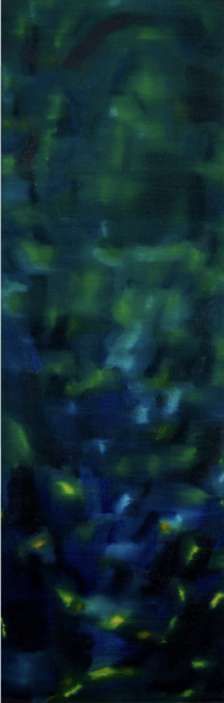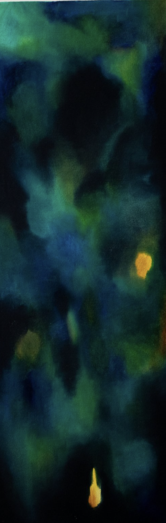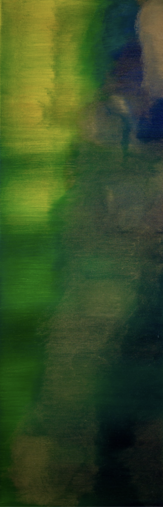In Around Town, a 10 x 30-inch oil painting, Wang creates a luminous world of deep greens and blues punctuated by flickering light. The composition suggests a serene yet mysterious landscape, reminiscent of the chromatic brilliance of Sonia Delaunay and the emotional depth of Mark Rothko. Summer Around Town, of the same dimensions, employs a similarly vibrant palette, blending greens and purples with subtle hints of warmth. The diffused application of paint creates a rhythmic interplay of form and color, mirroring the transience and beauty of fleeting moments in nature.