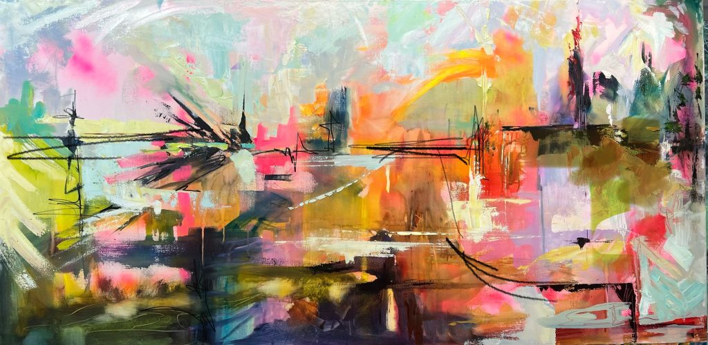 I like to start a painting with no intention or plan, laying down colours, shapes and lines, responding in the moment. I will add layers, scrapping into the paint, until I start to see something take shape. Often a landscape, sometimes a floral emerges. This is when I get excited and start to pull the image up from the canvas, still trying not to think too much and allow it to flow without force. I generally don't use any references but allow each stroke and each colour determine the next.