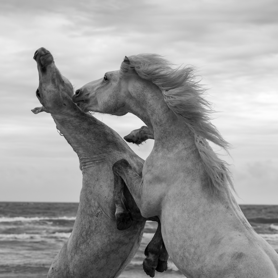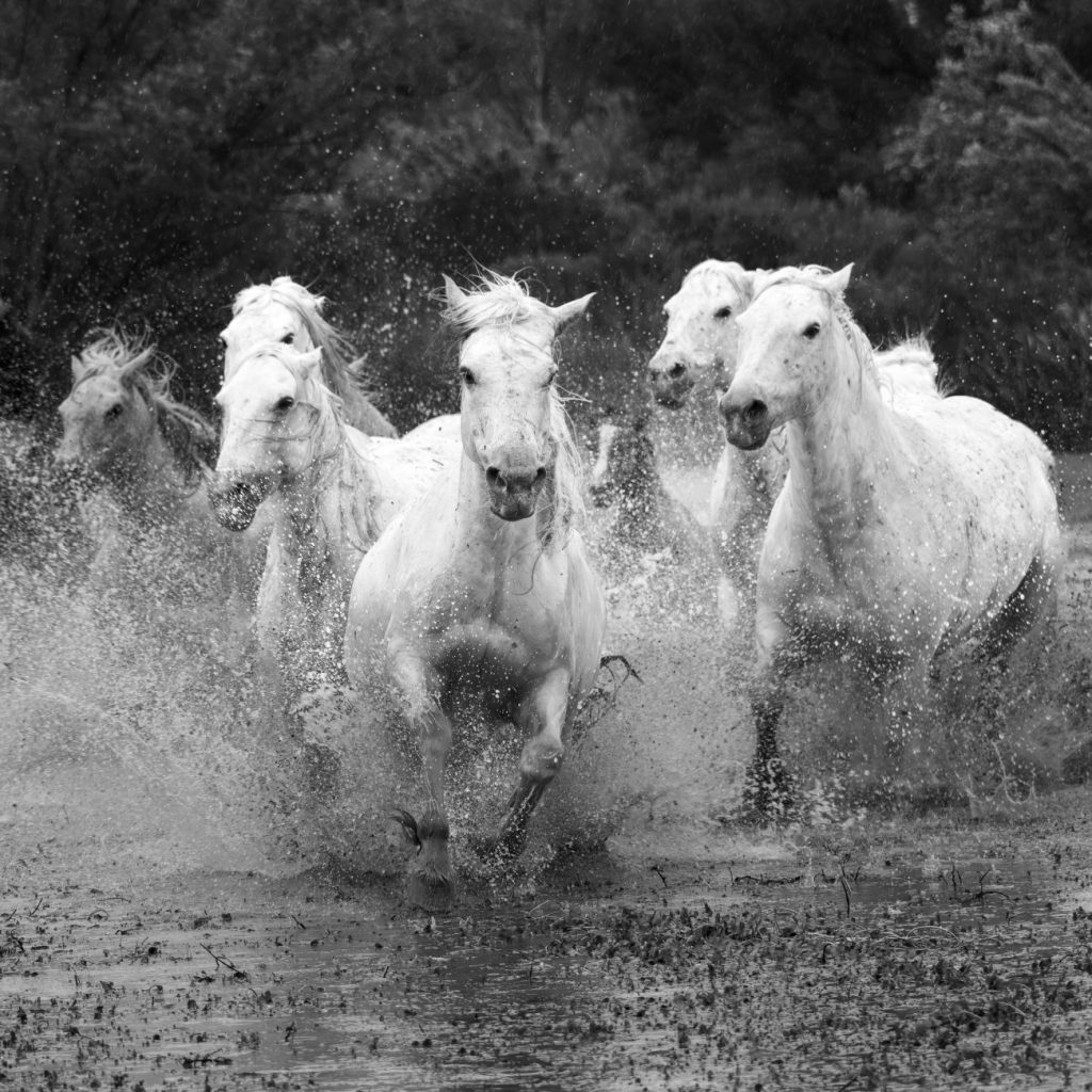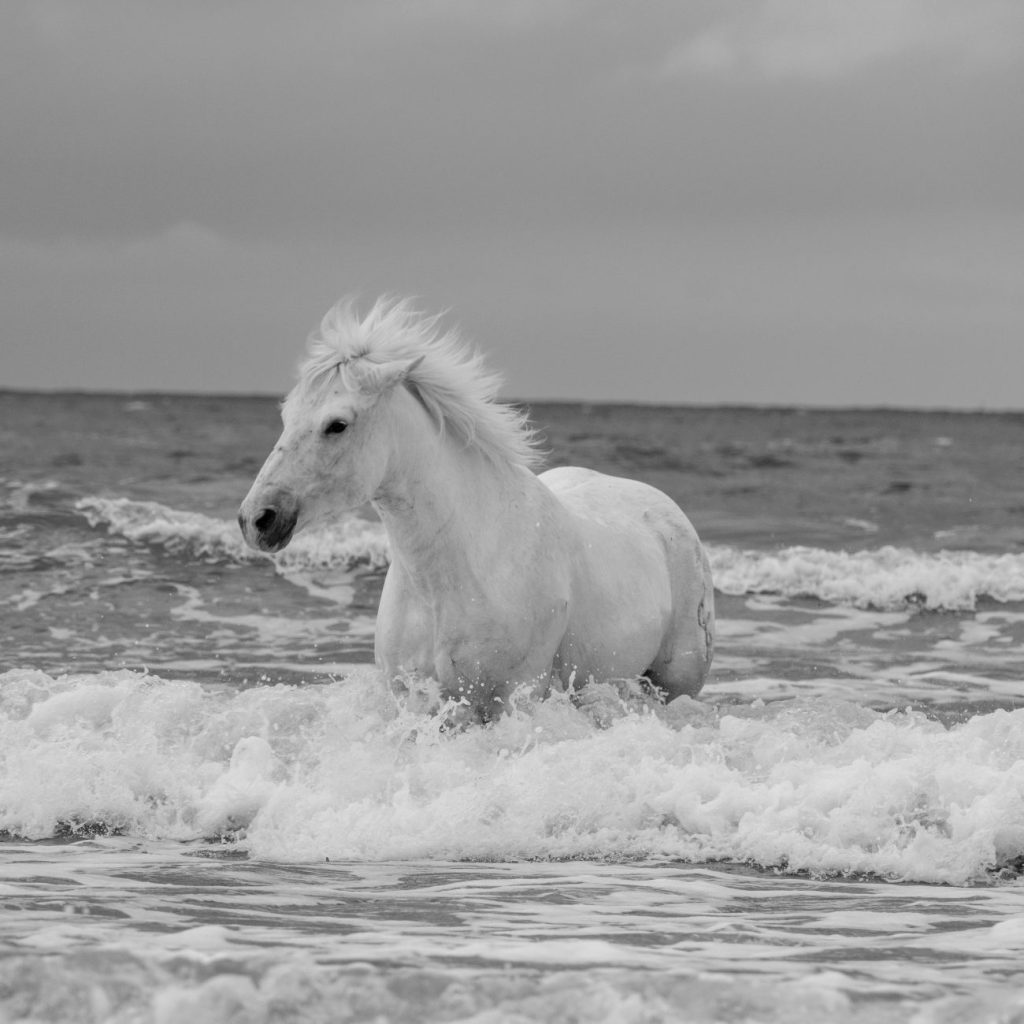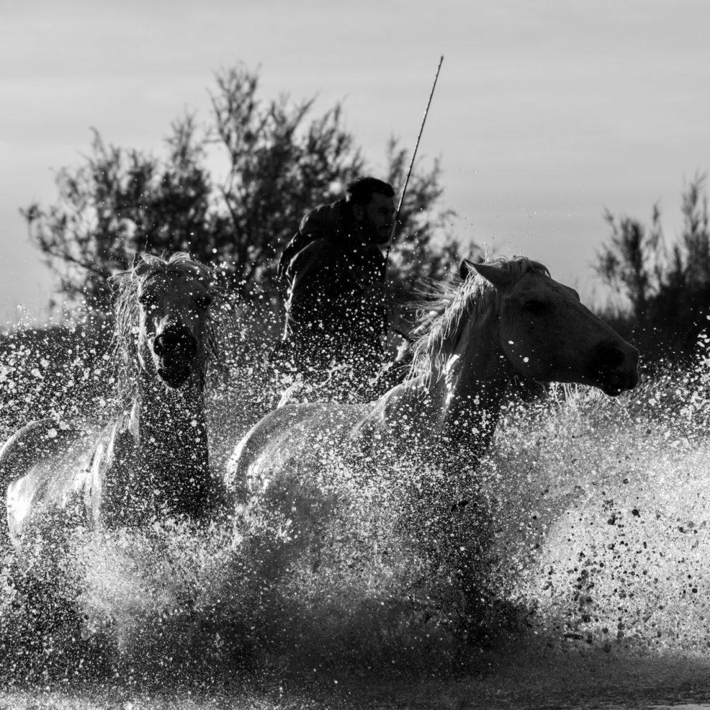The works “Sons of the Mistral” and “Untamed Spirits” exemplify Goldberg’s ability to channel the energy of motion into still images of remarkable vitality. In “Sons of the Mistral,” two horses rear and twist against a windswept sky, their sculptural forms rendered in dramatic chiaroscuro. The image calls to mind both the power of classical equestrian statues and the raw vitality of Eadweard Muybridge’s studies of animal locomotion. In “Untamed Spirits,” Goldberg captures a rider charging through water, framed by a surge of spray that recalls the dynamism of Romantic painting. These photographs are not simply depictions of animals but meditations on freedom, force, and the deep relationship between humanity and nature.