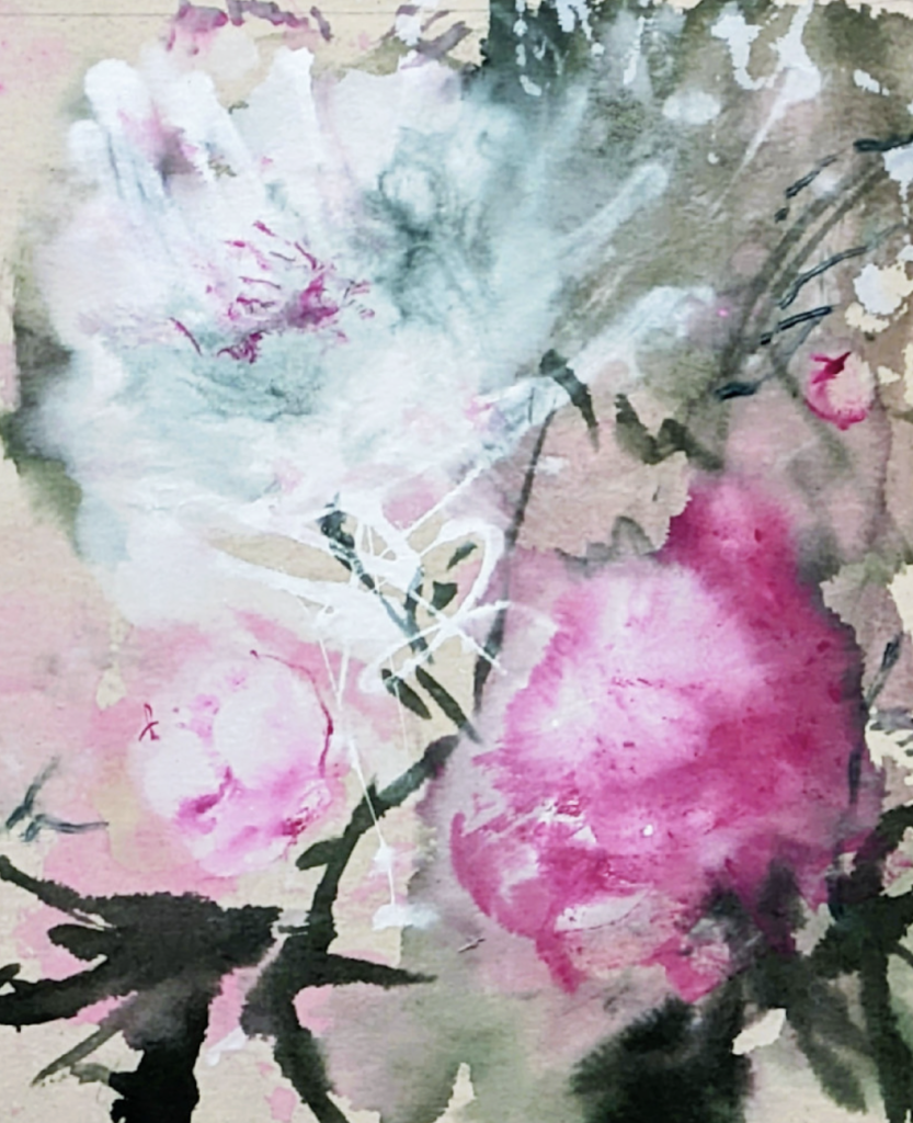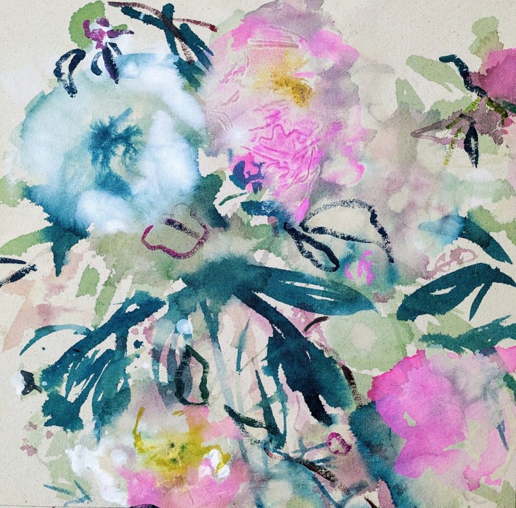 In works such as “Soft Prizes” and “Little Saints,” Myrick demonstrates a sensitivity to gesture and atmosphere. Sweeping washes of pinks, blues, and greens dissolve into one another, suggesting blooms in shifting light or impressions of foliage carried on the wind. Loose, expressive brushstrokes intermingle with more defined marks, creating a balance between control and spontaneity. The imagery recalls traditions of lyrical abstraction and echoes aspects of East Asian ink painting, where suggestion often carries more weight than literal representation. The resulting compositions embody both delicacy and vitality, evoking a dreamlike intimacy with nature.