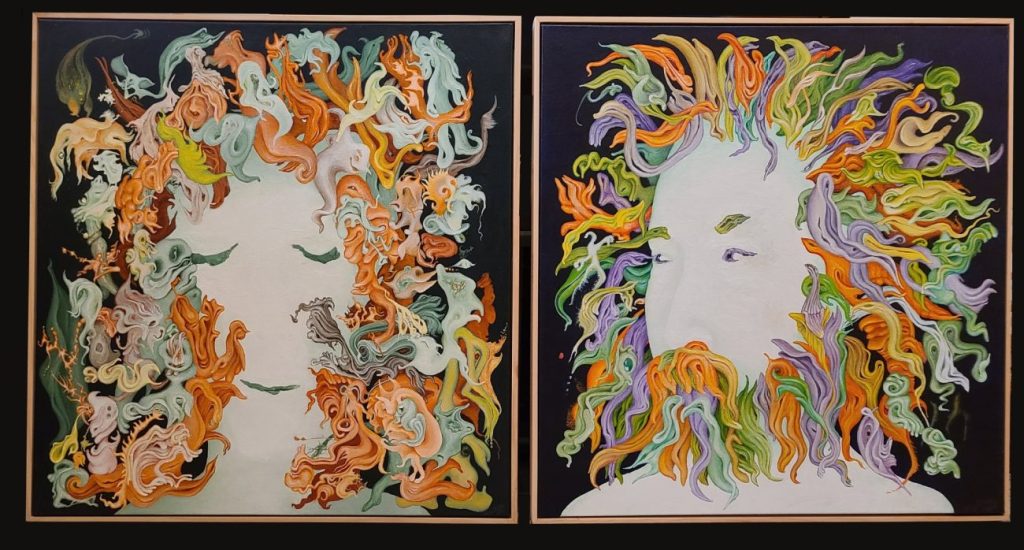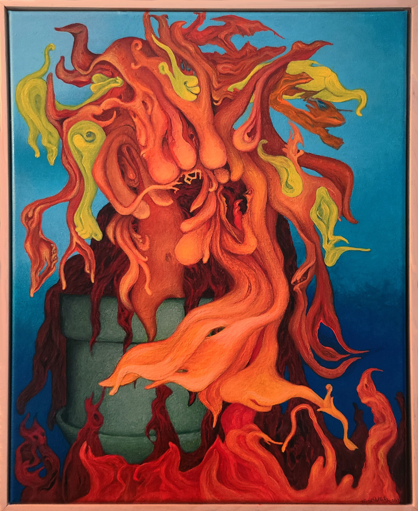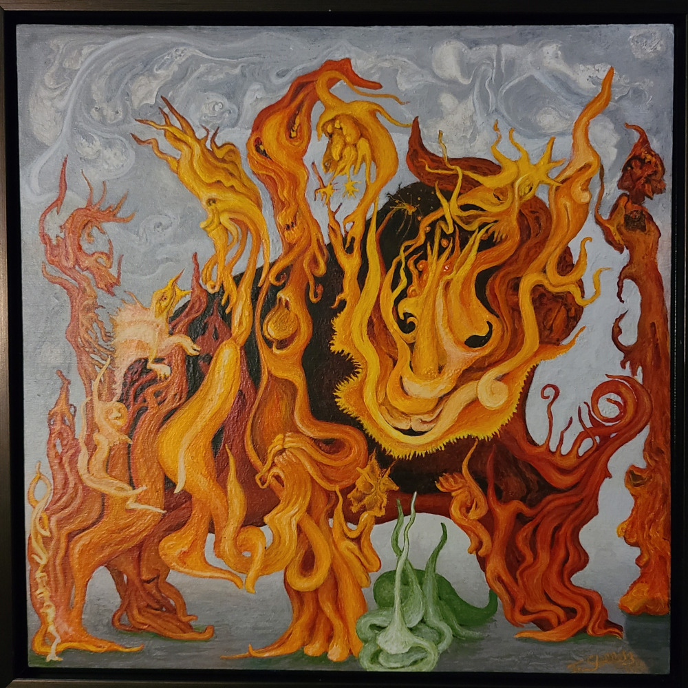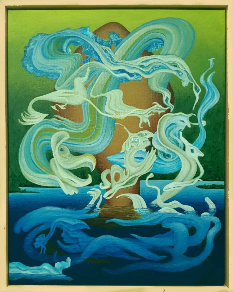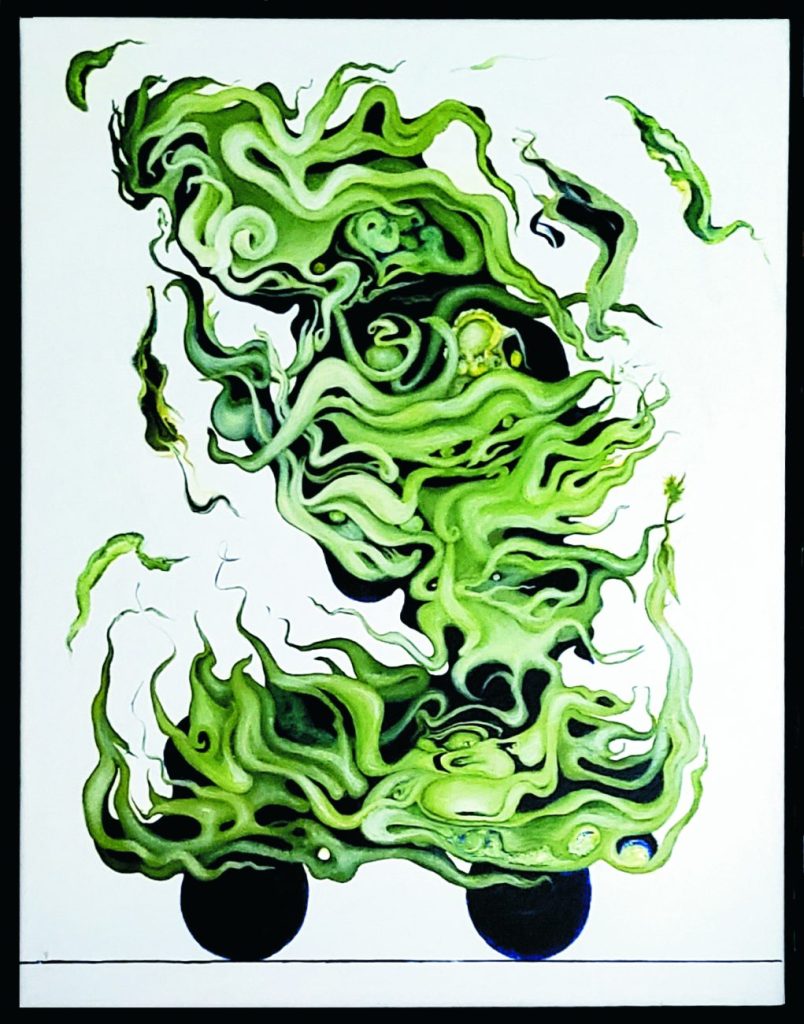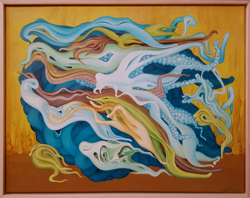 Each painting has its own evolution. My initial concern is in creating a unified composition of colour and form. As the piece progresses, I find the paint revealing playful forms, abstract characters with their own narratives. My work falls somewhat in line with AUTOMATSM, a method of painting (or writing) used by surrealists, that depends on “the re-emergence of subconscious images.” In applying chance or accidents to mark-making, the painting is to some extent freed of rational control. Hence the painting produced may be attributed in part to the subconscious. Just as in the work pioneered by Andre Masson, my work involves both unconscious and conscious activity.
