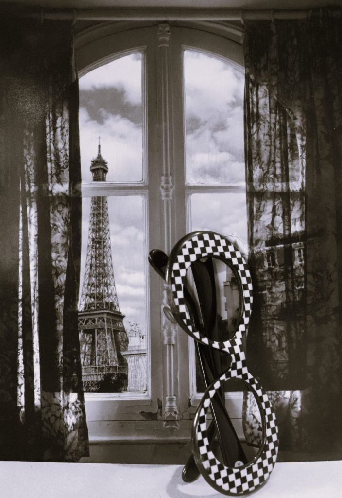 Black and White Checkered Glasses in Front of a Window and the Eiffel Tower - Printable on any material, 50 x 70 cm, $1,000