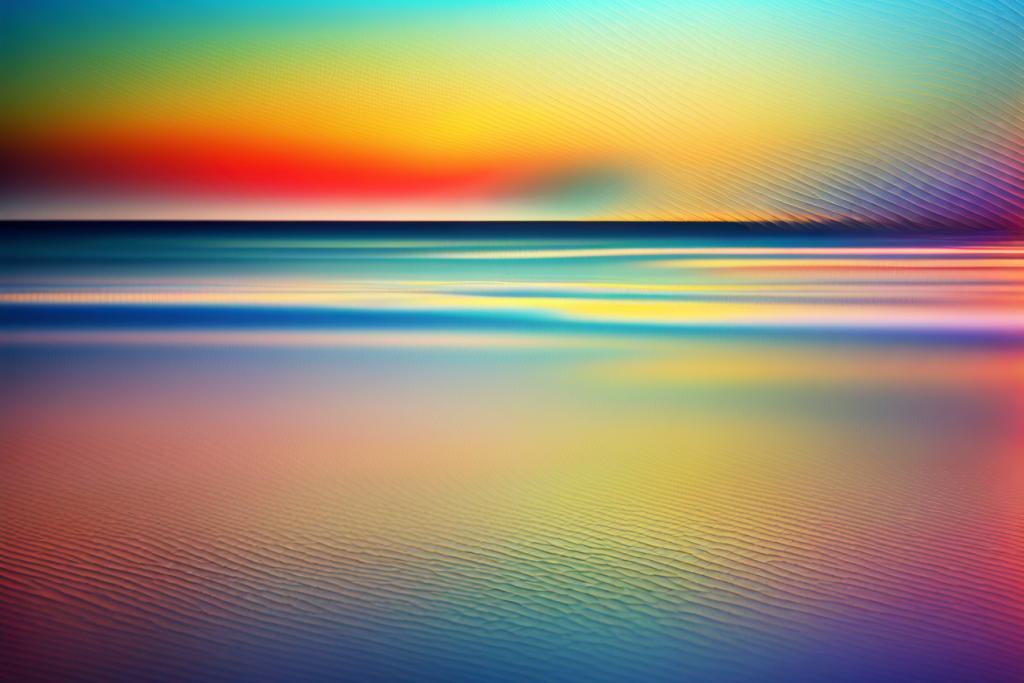 In works such as “GenAI-11_0_MDCA” and “Neon Mirage,” Florschuetz dissolves the boundaries between natural and synthetic image-making. Layers of color drift and merge, recalling the luminous tonal fields of Mark Rothko, yet with a distinctly photographic depth. Horizontal bands suggest distant horizons and bodies of water, but the surface is disrupted by rippling textures, evoking the subtle interference of memory and machine interpretation. The blending of deep blues, incandescent yellows, and scarlet reds transforms these landscapes into meditative thresholds, neither fully real nor entirely imagined. This aesthetic, somewhere between seascape minimalism and digital abstraction, encourages viewers to reconsider how reality is mediated through both lens and algorithm.