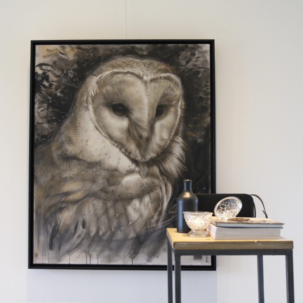 This bird is in itself is such a wonderful work of art that most of us would want to have it up close to take a real good look. I am doing the same by exploring the peculiar shapes with my paint.... studying how the light falls around it and how the shiney eyes contrast with the velvety fethers, to name a few things. Because there is so much to see. Also I love to explore the combination of realism and abstract form and patters, wich is a delight to do with this gorgeous barn owl.