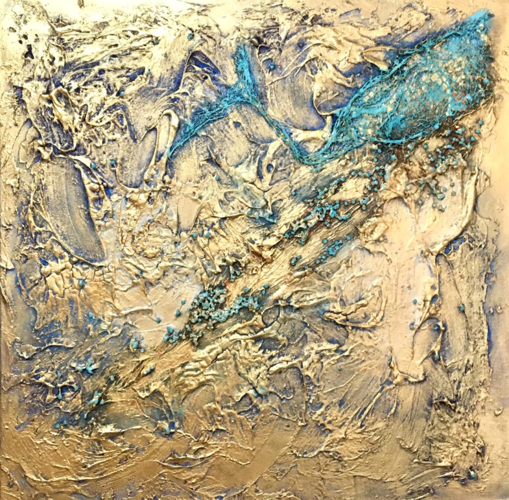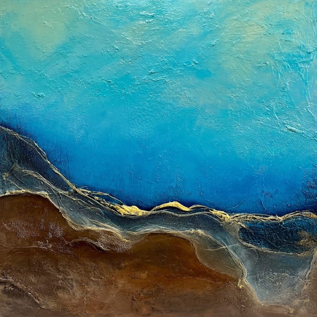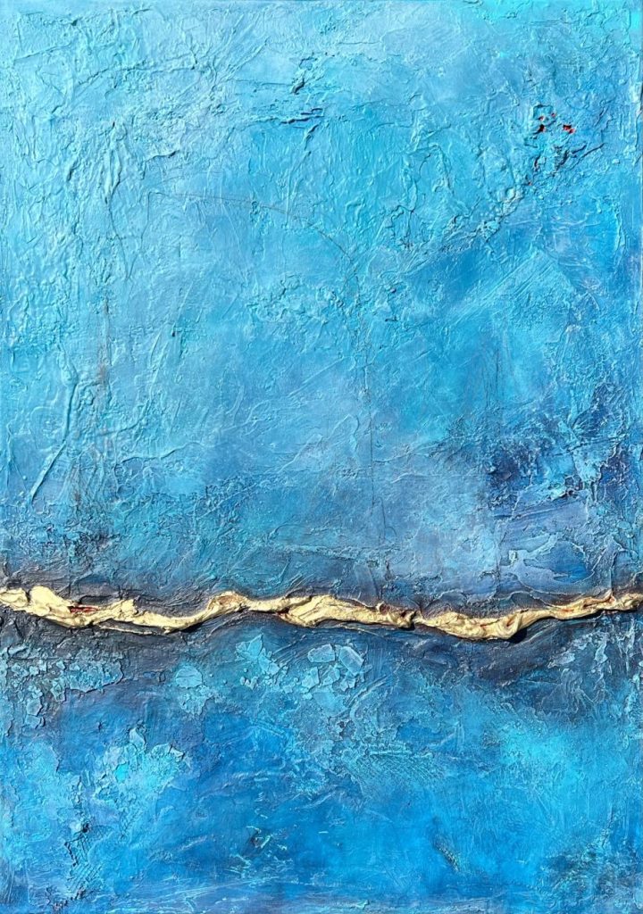 I create mixed media artworks using acrylics, pastes, fabrics, and textures. Blue is my anchor, evoking depth and calm. Gold brings contrast and light, often inspired by Kintsugi, the Japanese art of embracing brokenness with beauty.