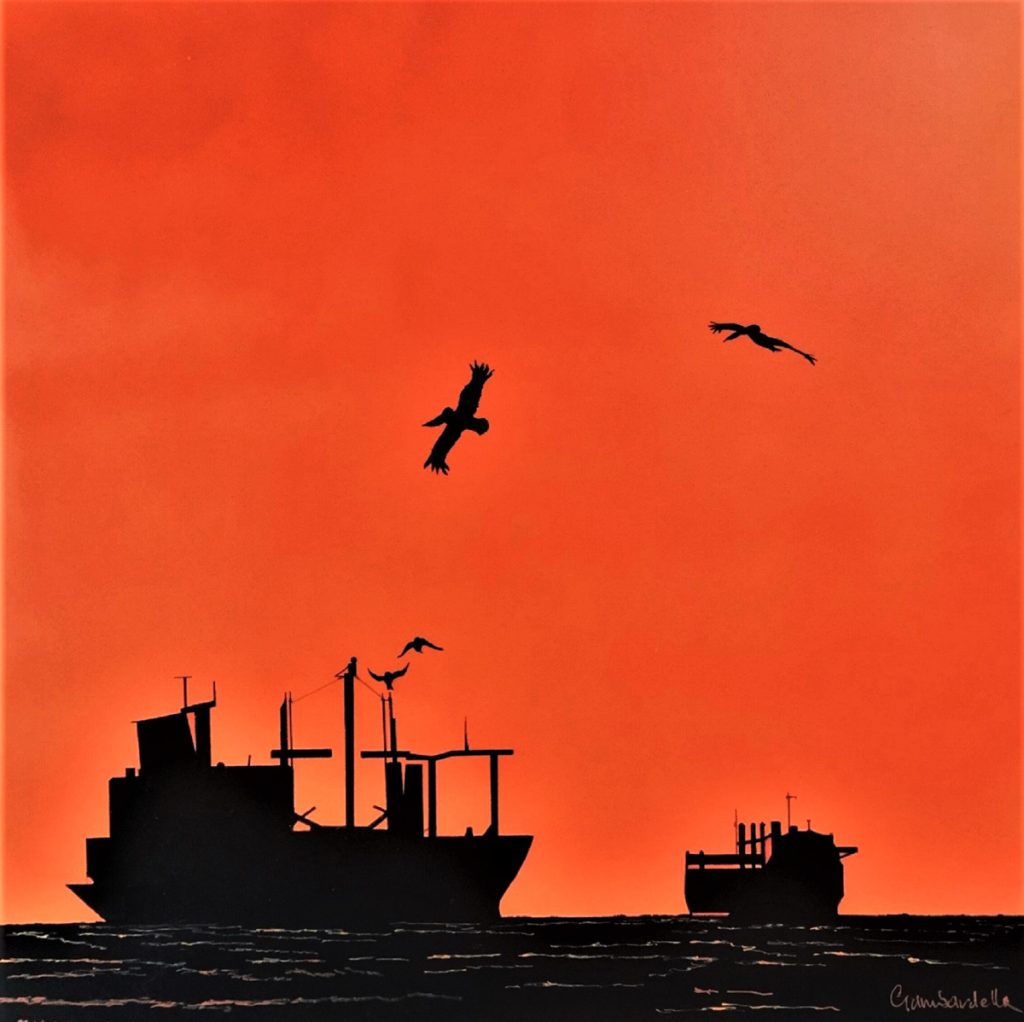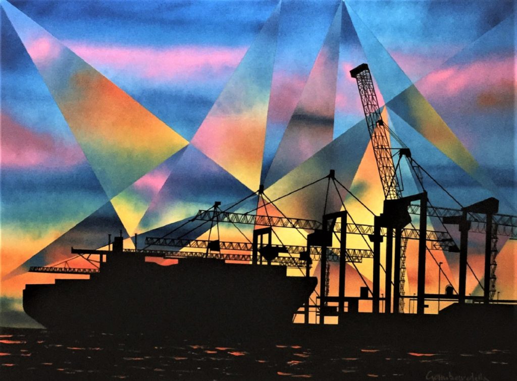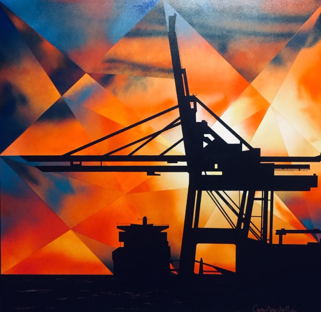 Gambardella’s recent series, which includes “Awaiting Clearance” and “Sunset at Melbourne Docklands,” highlights his focus on capturing industrial landscapes, specifically marine and dockside scenes, in an abstract yet evocative manner. His fascination with waterscapes and architecture, combined with his explorations in two-dimensional art, creates a bridge between tangible subjects and imaginative expressions. His work often features vibrant colors and geometric overlays, which imbue his marine-themed paintings with a dynamic energy and visual depth, setting him apart in his field. These compositions resonate with an appreciation for Australia’s coastal industrial landscapes, reflecting both personal observation and artistic innovation.