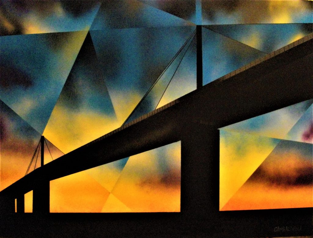 In this series, Gambardella’s mastery of light and color creates a visual symphony that transforms familiar industrial structures into scenes of abstract beauty. “Awaiting Clearance” captures the silhouette of dock cranes against an atmospheric sunset, with angular color blocks that bring a surreal quality to the scene. “Sunset at Melbourne Docklands” takes a similar approach, using intersecting lines and rich hues of blue and orange to convey a sense of movement and contrast, inviting viewers to see these mechanical structures through an imaginative lens. The geometric fragmentation of the background hints at Cubist influences, while the meticulous detail in his silhouettes reveals his commitment to realism, balancing abstraction and form seamlessly.