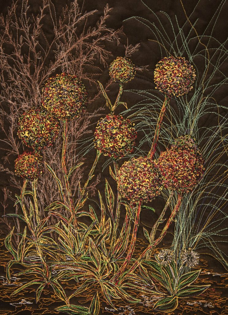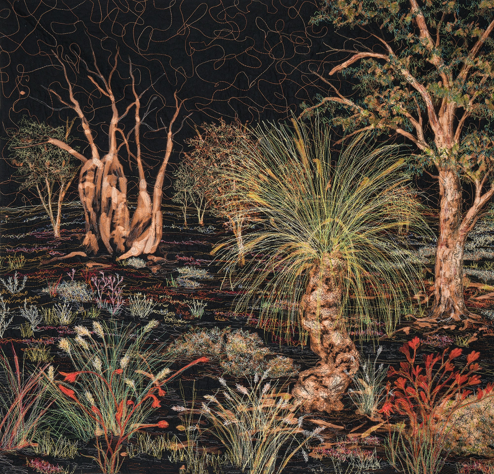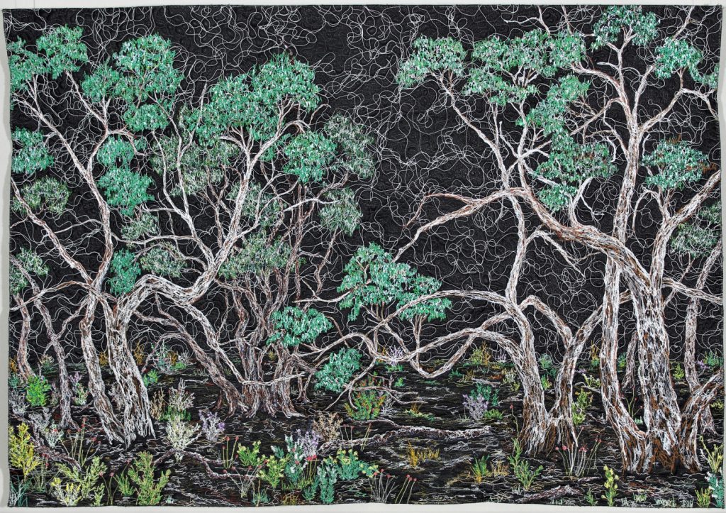 Before commencing any work, I attach canvas or fabric to an underneath layer of bag batting using free motion machine drawing in a repeated pattern. This repetition allows me to get into the right creative head space. Once complete, my first starting point is always a tree or a plant. From there I add more and more foliage, working from foreground to background. My work is improvisational, with no outlines or sketches. As I often work blind due to scrunching up my work to fit it in between the sewing machine arm and bed, a lot of time is taken balancing and rebalancing the design. I know a work is finished when I stop wanting to add or unpick content.