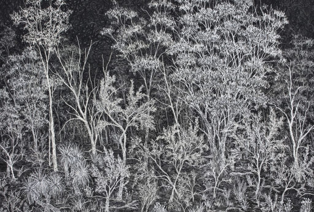 Moonahs at Midnight Free motion machine and acrylic marker drawing on black primed canvas 63 x 89 cm