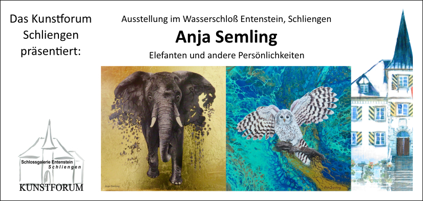 My large solo exhibition in the moated castle Entenstein, the town hall in Schliengen, is now open to the public. I am showing 51 works of art: large and small. Spread over 3 floors. The title is: “Elephants and other personalities”. There are wild animals and portraits of women as well as 4 queer pictures. I show old and new pictures, all unique!