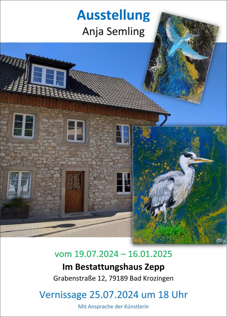 A small but fine exhibition with a selected collection of my paintings will be shown from July 19, 2024 to January 16, 2025 in Bad Krozingen (Germany). Since the exhibition is taking place in a funeral home, I will give a speech on the subject of “death” and my paintings, which show birds, but also other motifs, at the vernissage on July 19.