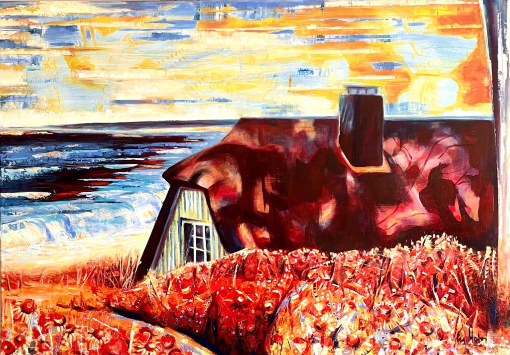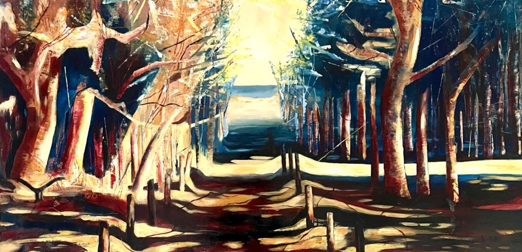 In “Play of Light,” Hahn employs oil paint to craft a visual metaphor for hope and despair, framed within a structured yet fluid composition. The interplay of light and shadow guides the viewer along a symbolic path, culminating in an open horizon that suggests renewal and possibility. The dichotomy of warm and cool tones on either side of the painting represents the emotional and rational facets of human experience, while the layered textures evoke a sense of haptic engagement. This approach recalls the psychological depth of Edward Hopper’s work, yet Hahn’s unique perspective on resilience and transformation makes the piece profoundly her own.