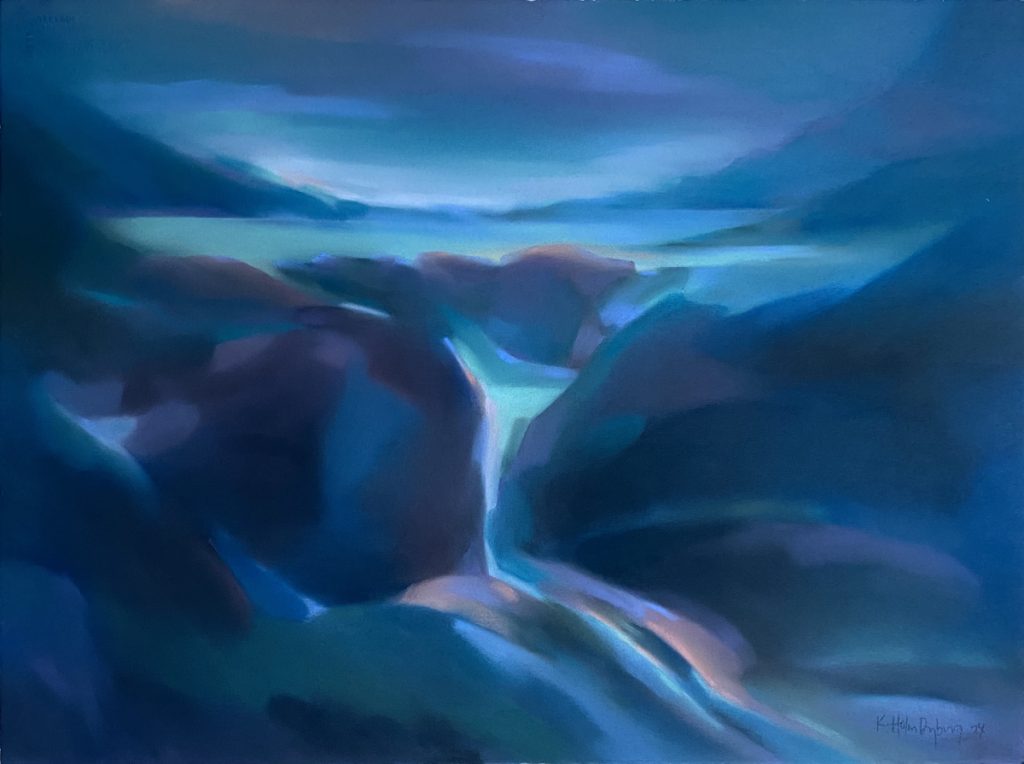 I am inspired by untouched nature and landscapes without traces of human activity. As part of nature we have the responsibility to protect and manage it on behalf of future generations. It’s important to me to tell the stories of these old landscapes surrounding me, as they set life in perspective. The motives behold the beauty and magnificence of the nature we are rapidly loosing to economical interests and shortsighted profit. They are imbued by a hope that they can contribute to change. The work process elevates the landscape, it becomes a soulscape, expressing moods that the viewer can recognise as they are descriptions of basic human experiences and emotions. Expressing myself through colour on paper speaks directly from soul to soul, without the limitations of words.